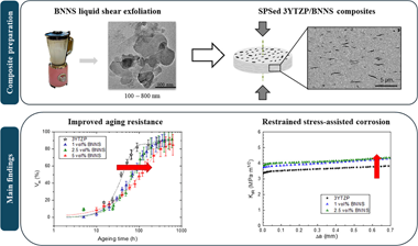 This paper explores the effectiveness of boron nitride nanosheets in preventing the premature failure of yttriastabilized tetragonal zirconia ceramics, particularly in humid environments. A simple, low-cost and scalable technique-shear exfoliation in a kitchen blender-was used to prepare BNNS, and pure zirconia and composites with 1, 2.5 and 5 vol. % BNNS were spark plasma sintered. Accelerated hydrothermal ageing experiments in autoclave revealed a remarkable improvement of low temperature degradation resistance in all the composites. Fracture toughness and slow crack growth of the composites with 1 and 2.5 vol. % BNNS were evaluated by bending tests performed in notched specimens. Although the composites presented fracture toughness values similar to those of the reference zirconia, an increase of similar to 18 % on crack-tip toughness was achieved. Similar Rcurves evaluated in air and in oil-impregnated 2.5 vol. % BNNS composites revealed a limitation of stress-assisted corrosion by water in zirconia, thanks to the BNNS incorporation.