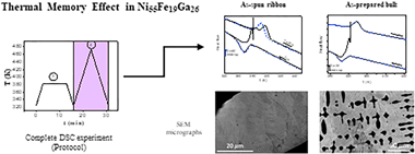 The thermal memory effect, TME, has been studied in Ni55Fe19Ga26 shape memory alloys, fabricated as ribbons via melt-spinning and as pellets via arc-melting, to evaluate its dependence on the martensitic structure and the macrostructure of the samples. When the reverse martensitic transformation is interrupted, a kinetic delay in the subsequent complete transformation is only evident in the ribbon samples, where the 14M modulated structure is the dominant phase. In contrast, degradation of the modulated structure or the presence of the γ phase significantly reduces the observed TME. In such cases, the magnitude of the TME approaches the detection limits of commercial calorimeters, and only high-resolution calorimeter at very low heating rate (40 mK h−1) can show the effect. Following the kinetic arrest and subsequent cooling, the reverse martensitic transformation was completed at several heating rates to confirm the athermal nature of the phenomenon.