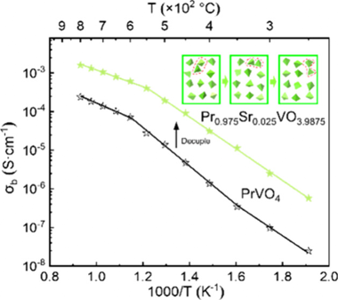Oxide-ion conductors based on tetrahedral anion-related oxides have attracted considerable attention due to their high oxygen-ion conductivity and potential applications in clean energy devices, such as solid-state fuel cells. In this study, we report the improvement of oxide-ion conductivity by Sr2+ doping in isolated tetrahedral zircon-type PrVO4. It is found that Pr0.975Sr0.025VO4-delta features the highest oxide-ion conductivity of 2.62 x 10-3 Scm-1 at 800 degrees C under air, with an oxygen transport number of 0.93. The formation and stabilization of oxygen vacancy defects, as well as the oxide-ion migration mechanism in PrVO4, were investigated through combining experimental characterizations and computing simulations. The results indicate that the concentration of oxygen vacancy defects increases with Sr2+ substitution, and the vacancies are accommodated by the formation of corner-sharing V2O7 dimers. Oxygen-ion migration proceeds via a cooperative mechanism involving V2O7-dimer breaking and reforming assisted by synergistic rotation and deformation of neighboring VO4 tetrahedra. The results provide valuable insights for further investigation and optimization of zircon-type oxides as potential oxide-ion conductors for electrochemical devices.