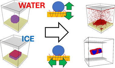 Within these studies, atomic-scale molecular dynamics simulations have been performed to analyze the behavior of water droplets and ice clusters on hydrophilic and hydrophobic surfaces subjected to high-frequency vibrations. The methodology applied herewith aimed at understanding the phenomena governing the anti-icing and deicing process enabled by surface acoustic waves (SAWs). The complex wave propagation was simplified by in-plane and out-of-plane substrate vibrations, which are relevant to the individual longitudinal and transverse components of SAWs. Since the efficiency of such an active system depends on the energy transfer from the vibrating substrate to water or ice, the agents influencing such transfer as well as the accompanying phenomena were studied in detail. Apart from the polarization of the substrate vibrations (in-plane/out-of-plane), the amplitude and frequency of these vibrations were analyzed through atomic-scale modeling. Further, the surface wettability effect was introduced as a critical factor within the simulation of water or ice sitting on the vibrating substrate. The results of these studies allow identification of the different phenomena responsible for water and ice removal from vibrating surfaces depending on the wave amplitude and frequency. The importance of substrate wetting for anti-icing and deicing has also been analyzed and discussed concerning the future design and optimization of SAW-based systems.