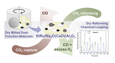 Herein we report a green mechanochemical synthesis with low energy input of dual-function materials for integrated CO2 capture and dry reforming of methane. The materials produced syngas during the CH4 step (up to 0.6 mmol g−1 CO and 7.7 mmol g−1 H2) and CO during the CO2 step (up to 3.1 mmol g−1) via the reverse Boudouard reaction due to the carbon produced from CH4 cracking.