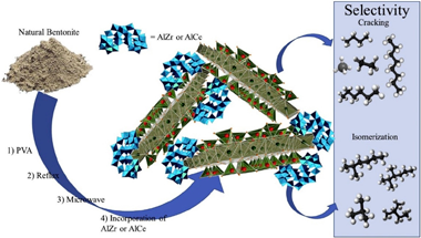 Enhancement of the main physicochemical properties of a natural bentonite was carried out by means of modifications using surfactant, reflux, microwave treatment and, subsequently, the incorporation of AlZr and AlCe species. The evolution of the main changes in each modification stage was evaluated by means of X-ray diffraction, N-2 sortometry, scanning microscopy (SEM), NH3-TPD, NH3-DRIFTS and CO adsorption at low temperature. For the evaluation of the catalytic behavior, the dehydration-dehydrogenation reactions of 2-propanol and hydro-conversion of decane were used; both of which generate, in addition, information regarding the acidic properties of the materials. The correlation of the number, type and acid strength with the catalytic behavior, allowed establishing the effect produced by both the delamination method and the nature of the incorporated cation. This generated tools that allow controlling the physicochemical properties, and more specifically, the enhancement of the acidity of new supports based on this type of natural clay mineral.