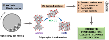 We carried out a rational design of catalyst supports by high-energy ball milling. Tailored mixtures of TiO2 crystalline phases were obtained using rotational speed and milling time as variable parameters. Polymorphic transformation from anatase to rutile through high-pressure TiO2 (II) as intermediate was confirmed by X-ray Diffraction (XRD), Raman Spectroscopy and Transmission Electron Microscopy (TEM). Also, starting material doubled its specific surface area due to particle fragmentation, as confirmed by surface area of Brunauer-Emmet-Teller (S-BET) and Scanning Electron Microscopy (SEM). Defects introduced during milling process generated oxygen vacancies in the surface and bulk of supports, as evidenced by X-ray Photoelectron Spectroscopy (XPS) and Electron Paramagnetic Resonance (EPR). Furthermore, longer milling time increased reducibility and oxygen mobility of supports, as observed by H-2 Temperature Programmed Reduction (H-2-TPR) and O-2 Temperature Programmed Desorption (O-2-TPD). Phase composition remained unchanged even under extreme conditions, highlighting the stability of unusual TiO2 (II) phase. Properties achieved in present materials could benefit metal-support interactions and play a major role in supported catalysts.
