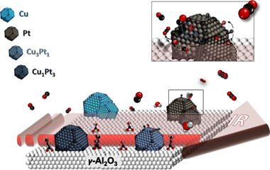 This work is devoted to the study of the role of both metals in the intermetallic PtxCuy/ γ Al2O3 catalysts commonly employed in CO-PROX reaction. Therefore, monometallic Pt and Cu based catalysts and PtCu intermetallic compound with different molar ratios (Pt3Cu1 and Pt1Cu3) supported catalysts were carefully synthesized and deeply characterized. Room temperature CO adsorptions by FTIR spectroscopy were carried out on the mono- and intermetallic catalysts being the monometallic catalyst determinant for the study. From the analysis of the nature of the platinum surface in Pt/ γ Al2O3, we have demonstrated that the role of Pt sites is based in the CO dissociation for the CO2 formation and also how the platinum surface is partially blocked by leftovers from the synthesis. Moreover, the study of the Cu/ γ Al2O3 and the bimetallic catalysts PtxCuy/ γ Al2O3 allowed elucidating the effect of the copper in the metallic site and support interphase as well as the role of copper in the hydrocarbon oxidation.
