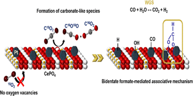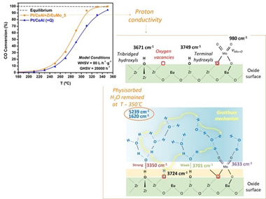 A conventional Pt/CeO2/Al(2)O(3)catalyst physically mixed with an ionic conductor (Mo- or Eu-doped ZrO2) was tested at high space velocity (20,000 h(-1)and 80 L h(-1)g(cat)(-1)) under model conditions (only with CO and H2O) and industrial conditions, with a realistic feed. The promoted system with the ionic conductor physically mixed showed better catalytic activity associated with better water dissociation and mobility, considered as a rate-determining step. The water activation was assessed by operando diffuse reflectance infrared fourier transformed spectroscopy (DRIFTS) studies under reaction conditions and the Mo-containing ionic conductor exhibited the presence of both dissociated (3724 cm(-1)) and physisorbed (5239 cm(-1)) water on the Eu-doped ZrO(2)solid solution, which supports the appearance of proton conductivity by Grotthuss mechanism. Moreover, the band at 3633 cm(-1)ascribed to hydrated Mo oxide, which increases with the temperature, explains the increase of catalytic activity when the physical mixture was used in a water gas shift (WGS) reaction.