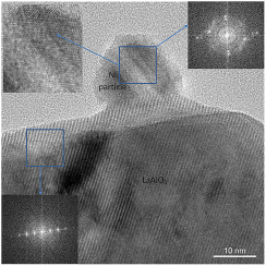 LaAl1-xNixO3 (with x = 0.05 and 0.2) perovskite oxides were successfully synthesized and its behavior under reduction atmosphere was studied. HRTEM and STEM studies, coupled to HAADF and EDX detection, allowed to evidence the Ni exsolution process to the surface of the solid and to build nano-catalytic centers. The size of these centers is independent of the reduction conditions in the range studied. The high specific surface of the raw material, its porosity and the structure defects could be responsible of the low temperature at which the exsolution process starts. The content of Ni dopants allows the control of Ni centers size on the surface and the synthesis method provides Ni-nanoparticles strongly anchored to the resultant support.