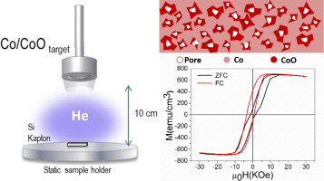 In this paper Co/CoO thick layers (hundreds of nanometers) of different porosity and oxidation degree were prepared in a magnetron sputtering deposition processby tailoring the DC sputtering power, as well as the process gas and target composition. The control of the synthesis parameters allowed the nanostructuration of the films with a singular distribution of closed pores and a controlled amount of CoO. We observed an exchange bias field of 2.8 KOe for porous Co/CoO composites, similar to Co/CoO bilayers but for coatings thicker than 300 nm. Besides, it was observed that the coating presents bistable magnetic features when cooled under zero field conditions as a result of the unusual exchange coupling.
