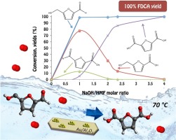 The catalytic activity of a simple Au/Al2O3 catalytic system prepared by the direct anionic exchange (DAE) method was evaluated in the selective 5-hydroxymethylfurfural (HMF) oxidation under mild conditions, using molecular oxygen as the oxidant. The influence of the HMF/NaOH ratio and reaction time on product yield and distribution were studied and discussed in detail. Extremely high activity and selectivity were observed in mild conditions, with 99% of 2,5-furandicarboxylic acid (FDCA) production at full HMF conversion after 4 h with the use of only 4 equivalents of NaOH at 70 degrees C. Catalyst viability and stability were verified by repeating the cycle up to five times. Changes in the nature of the support were also contemplated by introducing some ceria fraction, i.e. 20 wt%.