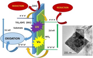 A highly faceted {001} TiO2 catalyst was hydrothermally synthesized by using Ti(IV)-isopropoxide precursor with aqueous HF addition. WO3 was synthesized by following a reported method. Coupled TiO2-WO3 samples were synthesized by adding the corresponding amount of WO3 to fluorinated TiO2 gel followed by a hydrothermal treatment. Additionally the synthesized systems were characterized by using X-ray powder diffraction (XRD), X-ray fluorescence spectrometry (XRF), field emission scanning electron microscopy (FE-SEM), transmission electron microscopy (TEM), UV–vis diffuse reflectance spectroscopy (DRS) and N2-adsorption (BET) for specific surface area determination. The photocatalytic activity of the single and coupled oxides was measured by means of three model reactions: the photo-oxidation of phenol (as a colourless substrate) and methyl orange (as a dye) and the photoreduction of Cr(VI) as K2Cr2O7. The coupling of WO3 with a highly faceted {001} TiO2 makes it possible to optimize the photocatalytic properties of the faceted material. In fact, {001} faceted TiO2 by itself presents a substantial improvement with respect to commercial TiO2(P25), as it can implement its photoactivity after the incorporation of WO3 with promising results, which can reduce the limitations of TiO2 in terms of its photoactivity, taking advantage of a higher percentage of solar radiation.