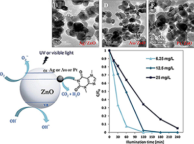 In this work, ZnO photocatalyst was modified with different noble metals (Pt, Ag and Au) through photodeposition method and then characterized by different techniques (XRD, XRF, BET, UV–vis DRS, FESEM, and XPS). The addition of noble metals produces important changes in the light absorption properties with a significant absorbance in the visible region due to the existence of surface plasmon resonance (SPR) observed at about 450 nm and 550 nm for ZnO modified with Ag and Au, respectively. The morphology of the samples was studied by TEM and the size ranges of the different metals were estimated. Noble metal nanoparticles were in every case heterogeneously deposited on the larger ZnO particles. All the prepared photocatalysts were tested in the photocatalytic removal of caffeine (toxic and persistent emerging compound) under UV and visible light irradiation. It was observed an enhancement of photocatalytic caffeine removal from aqueous solutions under UV light irradiation with the increase of metal content (from 0.5 to 1 wt %) for ZnO modified with Ag and Au (Ag/ZnO and Au/ZnO). In particular, Ag/ZnO and Au/ZnO with higher Ag and Au content (1 wt %) allowed to achieve the almost complete caffeine degradation after only 30 min and a TOC removal higher than 90% after 4 h of UV light irradiation. These two photocatalysts were investigated also under visible light irradiation and it was found that their photocatalytic performances were strongly enhanced in presence of visible light compared to unmodified ZnO. In particular, Ag/ZnO photocatalyst was able to reach the complete caffeine degradation and a TOC removal of about 70% after 4 h of visible light irradiation.