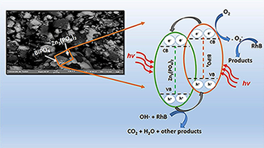In this work, a facile method was used to synthesize the Zn3(PO4)2/BiPO4 composite photocatalysts with different Bi contents followed by heat treatment at 900 °C for 3 h. The as-prepared samples were studied by a variety of characterization techniques including X-ray diffraction (XRD), Scanning Electron Microscopy (SEM) combined with energy dispersive X-ray diffraction (EDX), Transmission electron microscopy (TEM), X-ray photoelectron spectroscopy (XPS) and UV–vis diffuse reflectance spectroscopy (DRS). The UV–vis spectroscopy was used to analyze the evolution of Rhodamine B discoloration in presence of the synthesized phosphate photocatalysts. The XRD, SEM-EDX, TEM, DRS and XPS analyses confirmed the formation of heterojunction structure between both materials, during the process of co-precipitation and ulterior heat treatment. The photocatalytic tests showed that photocatalytic ability of the 70% Bi-Zn3(PO4)2 composites was higher than that of pure Zn3(PO4)2 and BiPO4 after 1 h of UV-illumination. The obviously enhanced photocatalytic activity of the 70% Bi-Zn3(PO4)2 sample could be mainly attributed to the formation of the heterojunction, accelerating the separation of photogenerated charge carriers. A plausible mechanism of the photocatalytic degradation of RhB on Zn3(PO4)2/BiPO4 composites is proposed. The reduction in the Chemical Oxygen Demand (COD) revealed the mineralization of dye along with color removal. Thus, it can be suggested that the 70% Bi-Zn3(PO4)2 can serve as a promising photocatalyst in the degradation of organic contaminants under UV light.