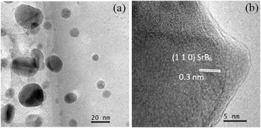 The nanoparticles of strontium hexaboride (SrB6) were synthesized by a mechanically induced magnesiothermic combustion in the Mg/B2O3/SrO system. Ignition time in this system was recorded to be 23 min of milling. X-ray diffraction(XRD), X-ray photoelectron spectroscopy (XPS), and high-resolution transmission electron microscopy (HRTEM) techniques were used to characterize the combustion product. Thermal analysis was employed to assess the formation mechanism. It was revealed that Mg initially reduced B2O3 in a combustive manner to generate elemental boron and a large amount of heat, resulting in the reduction of SrO by Mg at high temperature. The in-situ formed elemental Sr and B react immediately to generate SrB6. Thermoelectric properties of consolidated SrB6, including thermal conductivity, Seebeck coefficient, electrical conductivity, and figure-of-merit were evaluated at the temperature range of 300–873 K.