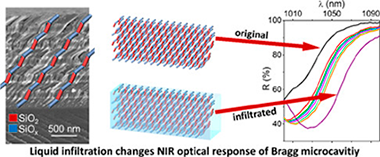 Traditionally porous silicon based photonic structures have been prepared by electrochemically etching of silicon. In this work, porous multilayers of nanocolumnar SiOx and SiO2 thin films acting as near infrared (NIR) 1D-photonic nanostructures are prepared by magnetron sputtering deposition at oblique angles (MS-OA). Simultaneous control of porosity and stoichiometry of the stacked films is achieved by adjusting the deposition angle and oxygen partial pressure according to a parametric formula. This new methodologoy is proved for the synthesis of SiOx thin films with x close to 0.4, 0.8, 1.2, 1.6 and nanostructures varying from compact (at 0 degrees deposition angle) to highly porous and nanocolumnar (at 70 degrees and 85 degrees deposition angles). The strict control of composition, structure and nanostructure provided by this technique permits a fine tuning of the absorption edge and refraction index at 1500 nm of the porous films and their manufacturing in the form of SiOx-SiO2 porous multilayers acting as near infrared (NIR) 1D-photonic structures with well-defined optofluidic responses. Liquid tunable NIR Bragg mirrors and Bragg microcavities for liquid sensing applications are presented as proof of concept of the possibilities of this MS-OA manufacturing method as an alternative to the conventional electrochemical fabrication of silicon based photonic structures.