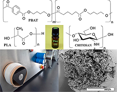 Biodegradable aliphatic polyesters are an alternative to reduce the use of synthetic plastic materials that cause severe damage to the environment. Formulations based on poly (lactic acid) (PLA) and poly (butylene adipate-co-terephthalate) (PBAT), were mixed in a 60:40 ratio, adding different concentrations of pine essential oil through the use of extrusion technology to obtain biodegradable polymer fibers. Some formulations were coated with chitosan. All the elaborated fibers were characterized by Scanning Electron Microscopy (SEM), Fourier Transform Infrared Spectroscopy-Attenuated Total Reflection (FTIR-ATR), Differential Scanning Calorimetry (DSC), X-ray Diffraction (XRD) and mechanical properties. The SEM studies showed that the PBAT improves the tenacity and provides greater elasticity promoting the interaction between the blends phases with fibril formation. In the FTIR-ATR analysis, compatibility between the blends was observed due to a possible interaction of the carbonyl group of PBAT with PLA. The DSC and the mechanical properties showed partial miscibility of the blends, indicating, that the plasticizing action of the essential oil gave greater mobility, flexibility, less rigidity and crystallization in the blends. A lower Young's modulus and greater elongation at break was also observed.