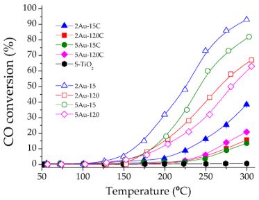 For this present work, a series of Au-metallized TiO2 catalysts were synthesized and characterized in order to compare their performance in two different catalytic environments: the phenol degradation that occurs during the liquid phase and in the CO oxidation phase, which proceeds the gas phase. The obtained materials were analyzed by different techniques such as XRF, SBET, XRD, TEM, XPS, and UV-Vis DRS. Although the metallization was not totally efficient in all cases, the amount of noble metal loaded depended strongly on the deposition time. Furthermore, the differences in the amount of loaded gold were important factors influencing the physicochemical properties of the catalysts, and consequently, their performances in the studied reactors. The addition of gold represented a considerable increase in the phenol conversion when compared with that of the TiO2, despite the small amount of noble metal loaded. However, this was not the case in the CO oxidation reaction. Beyond the differences in the phase where the reaction occurred, the loss of catalytic activity during the CO oxidation reaction was directly related to the sintering of the gold nanoparticles.