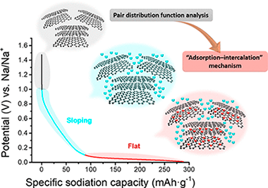 Hard carbons are the material of choice as negative electrode in sodium ion batteries. Despite being extensively studied, there is still debate regarding the mechanisms responsible for storage in low- and high-potential regions. This work presents a comprehensive approach to elucidate the involved storage mechanisms when Na ions insert into such disordered structures. Synchrotron X-ray total scattering experiments were performed to access quantitative information on atomic ordering in these materials at the nanoscale. Results prove that hard carbons undergo an atomic rearrangement as the graphene layers cross-link at intermediate temperatures (1200-1600 degrees C), resulting in an increase of the average interplanar distance up to 1400 degrees C, followed by a progressive decrease. This increase correlates with the positive trend in the reversible capacity of biomass-derived carbons when processed up to 1200-1600 degrees C due to an increased capacity at low potential (<= 0.1 V vs Na/Na+). A decrease in achievable sloping capacity with increasing heat-treatment temperature arises from larger crystalline domains and a lower concentration of defects. The observed correlation between structural parameters and electrochemical properties clearly supports that the main storage of Na ions into a hard-carbon structure is based on an adsorption-intercalation mechanism.