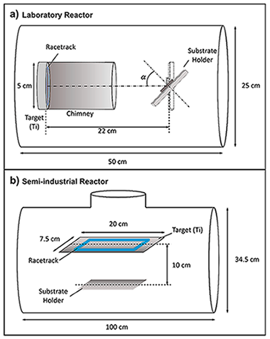 Based on an already tested laboratory procedure, a new magnetron sputtering methodology to simultaneously coat two-sides of large area implants (up to similar to 15 cm(2)) with Ti nanocolumns in industrial reactors has been developed. By analyzing the required growth conditions in a laboratory setup, a new geometry and methodology have been proposed and tested in a semi-industrial scale reactor. A bone plate (DePuy Synthes) and a pseudo-rectangular bone plate extracted from a patient were coated following the new methodology, obtaining that their osteoblast proliferation efficiency and antibacterial functionality were equivalent to the coatings grown in the laboratory reactor on small areas. In particular, two kinds of experiments were performed: Analysis of bacterial adhesion and biofilm formation, and osteoblasts-bacteria competitive in vitro growth scenarios. In all these cases, the coatings show an opposite behavior toward osteoblast and bacterial proliferation, demonstrating that the proposed methodology represents a valid approach for industrial production and practical application of nanostructured titanium coatings.