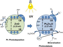 ZnO nanoparticles have been previously synthesized by a facile precipitation procedure by mixing aqueous solutions of Zn(II) acetate and dissolved Na2CO3 at pH ca. 7.0 without the addition of a template. The as-prepared ZnO material was anealed at 400 °C in air for 2 h. The Pt-ZnO catalysts (0.5 or 1.0 Pt wt.%) were obtained by photochemical deposition method on the surface of the prepared ZnO sample, using hexachloroplatinic acid (H2PtCl6). It has been shown that Zn2+ is lost from the photocatalyst to the medium and a replacement of the cationic vacancies of Zn2+ by Pt4+ cations occurs during the platinization process of the ZnO samples, regardless of whether the platinum metal photodeposition process. The as-prepared catalysts were characterized by XRD, BET, FE-SEM, TEM, XPS and diffuse reflectance spectroscopy (DRS). Three different probe molecules were used to evaluate the photocatalytic properties under UV-illumination: Methyl Orange and Rhodamine B were chosen as dye substrates and Phenol as a transparent substrate. High conversion values (ca. 100%) and a total organic carbon (TOC) removal of 90–96%, were obtained over these photocatalysts after 160 min of UV illumination. In general, it was observed that the presence of Pt on ZnO affects the lattice parameters and the crystallite size. Although ZnO can completely degrade RhB, MO and Phenol totally in ca. 60 min, the process is more efficient for Pt–ZnO photocatalysts.