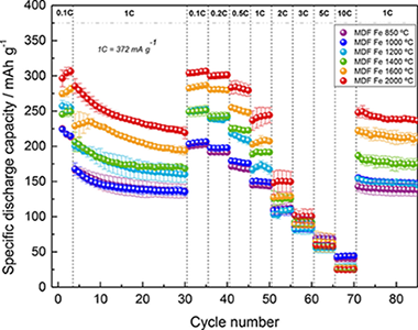 Graphitized carbon materials from biomass resources were successfully synthesized with an iron catalyst, and their electrochemical performance as anode materials for lithium-ion batteries (LIBs) was investigated. Peak pyrolysis temperatures between 850 and 2000 degrees C were covered to study the effect of crystallinity and microstructural parameters on the anodic behavior, with a focus on the first-cycle Coulombic efficiency, reversible specific capacity, and rate performance. In terms of capacity, results at the highest temperatures are comparable to those of commercially used synthetic graphite derived from a petroleum coke precursor at higher temperatures, and up to twice as much as that of uncatalyzed biomass-derived carbons. The opportunity to graphitize low-cost biomass resources at moderate temperatures through this one-step environmentally friendly process, and the positive effects on the specific capacity, make it interesting to develop more sustainable graphite-based anodes for LIBs.