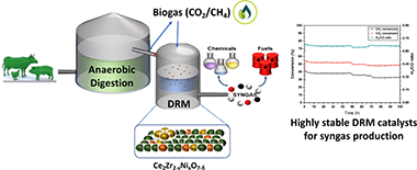 The increasing anthropogenic emissions of greenhouse gases (GHG) is encouraging extensive research in CO2 utilisation. Dry reforming of methane (DRM) depicts a viable strategy to convert both CO2 and CH4 into syngas, a worthwhile chemical intermediate. Among the different active phases for DRM, the use of nickel as catalyst is economically favourable, but typically deactivates due to sintering and carbon deposition. The stabilisation of Ni at different loadings in cerium zirconate inorganic complex structures is investigated in this work as strategy to develop robust Ni-based DRM catalysts. XRD and TPR-H2 analyses confirmed the existence of different phases according to the Ni loading in these materials. Besides, superficial Ni is observed as well as the existence of a CeNiO3 perovskite structure. The catalytic activity was tested, proving that 10 wt.% Ni loading is the optimum which maximises conversion. This catalyst was also tested in long-term stability experiments at 600 and 800°C in order to study the potential deactivation issues at two different temperatures. At 600°C, carbon formation is the main cause of catalytic deactivation, whereas a robust stability is shown at 800°C, observing no sintering of the active phase evidencing the success of this strategy rendering a new family of economically appealing CO2 and biogas mixtures upgrading catalysts.