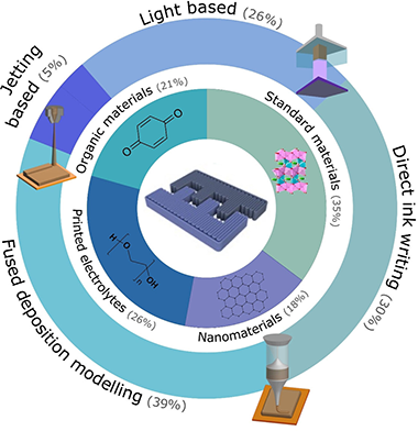 The review provides an overview of the latest innovations, trends, and challenges in the field of 3D-printed metal and metal-ion batteries. It focuses on the materials used in the printing of batteries, including electrodes, electrolytes, and other electroactive components. Compared to other high-quality reviews on the topic, this review provides a broader selection of materials that are expected to gain attention in the next few years, such as redox-active polymers and metal-organic frameworks. This work gives an overview and insight into the latest trends in printing techniques as well as a statistical review of their uses and strengths. We have also gathered the latest works done for each of the material types, and we have taken the opportunity to put them in context and use them to exemplify in which direction is the field going. The review concludes with a critical view of the challenges ahead and a discussion of the direction that the field is taking as well as the external factors that might help to define its future.