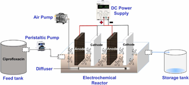 Ciprofloxacin (CIP) is a fluoroquinolone antibiotic that is widely used across the globe and its release is a serious concern due to its persistent nature, partial degradation, and simple transport through different environmental matrices. Pharmaceuticals have been degraded effectively by electrochemical oxidation. Exploring ways to in-crease the mineralization of these compounds while maintaining low power consumption is important. In this study, the treatability and degradation of CIP were investigated by using cobalt oxide-coated stainless steel (SS) electrodes in a lab-scale electrochemical (EC) reactor. The performance of the electrochemical reactor was determined under various operational conditions. The feed wastewater was synthetically prepared in the laboratory with varying concentrations of CIP ranging from 8 to 41 mg/L and the EC reactor was operated with an applied voltage and airflow rate of 2.6-9.3 volts and 1.6-3.5 L/min, respectively. A 3-factor central composite experimental design (CCD) was developed by using response surface methodology (RSM) in Design-Expert software. At a residence time of 27 min, initial concentration of 25 mg/L, airflow rate of 2.5 L/min, and applied voltage of 6 volts, the EC reactor achieved a removal efficiency of 70.8% for CIP with SS electrodes. On the contrary, the removal efficiency was increased to 91.5% at a reduced residence time of 21 min with cobalt oxide (Co3O4) coated over SS plates. The results indicated that Co3O4@SS electrodes resulted in better removal efficiency of CIP at a lower residence time. This system can be used as a robust benchmark for a single or consortium of antibiotics present in domestic and hospital wastewater.