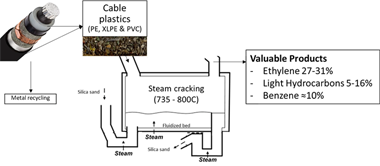 The use of plastic materials in a circular way requires a technology that can treat any plastic waste and produce the same quality of product as the original. Cable plastic residue from metal recycling of electric wires is composed of cross-linked polyethene (XLPE) and PVC, which is a mixture that cannot be mechanically recycled today. Through thermochemical processes, polymer chains are broken into syngas and monomers, which can be further used in the chemical industry. However, feedstock recycling of such a mixture (XLPE, PVC) has been scarcely studied on an industrial scale. Here, the steam cracking of cable plastic was studied in an industrial fluidised bed, aiming to convert cable plastics into valuable products. Two process temperatures were tested: 730 degrees C and 800 degrees C. The results show that the products consist of 27-31 wt% ethylene and propylene, 5-16% wt. % other linear hydrocarbons, and more than 10 wt% benzene. Therefore, 40%-60% of the products are highvalue chemicals that could be recovered via steam cracking of cable plastic.