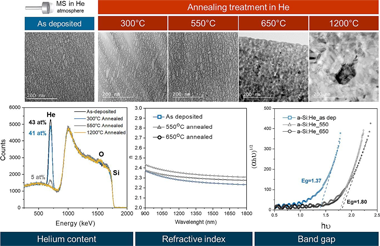 In this work, annealing process in He atmosphere from 300 °C up to 1200 °C is performed to evaluate stability after the release of He from the a-Si:He coatings (thickness ∼1700 nm) and to favor matrix crystallization and defect evolution. The work is focused on these effects on the silicon film and its properties. The composition and microstructural evolution of the coatings annealed to temperatures as high as 1200° were investigated by electron microscopy and X-Ray diffraction. Annealing effects on the optical properties and bandgap of the silicon coatings were evaluated by ellipsometry and UV–Vis spectrometry. Helium release from the coating, densification, defects evolution and ordering due to crystallization have a small effect on the refractive index, but cause a significant change in the material band gap from 1.37 eV to 1.80 eV.