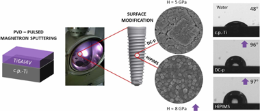 Although titanium is widely used as biomaterial, the control of the interface properties between its surface and the surrounding physiological environment (like bone, other tissues or biofluids) results crucial to achieve a successful osseointegration and good biomechanical and functional performance. In this work, commercially pure titanium (Grade IV) discs obtained by conventional powder metallurgy were coated with 1-3 mu m of Ti6Al4V (Grade V) alloy using DC-pulsed or high-power impulse magnetron sputtering (HiPIMS) technique with the aim of improving their biomedical performance. SEM, confocal microscopy, X-ray dif-fraction, nanoindentation and wetting measurements are used to evaluate the bio-interface role of the titanium-coated implants. Conformal Ti6Al4V coatings with controlled nano-roughness can be deposited with enhanced mechanical (H = 5-8 GPa; E = 140-160 GPa) and hydrophobic properties thanks to a dense columnar structure. The increased Ti-O bonding at the interface helps to prevent the corrosion due to the formation of a surface passivation layer. Particularly in the case of the HiPIMS process, the surface mod-ification of titanium implants (chemistry, morphology and structure) appears as an effective strategy for satisfying the biomedical requirements and functionality, with enhanced mechanical properties and na-nostructuration for prevention of bacteria colonization.