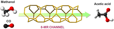 Methanol carbonylation was evaluated over heterogeneous catalysts based on Cu-exchanged zeolitic materials with different topology: Cu@MOR, Cu@FER, and Cu@ZSM-5. Despite the similar Si/Al ratios, it is crucial to acknowledge that the acid strength is influenced by the framework topology, as supported by the NH3-TPD results. This, along with other characterization techniques allowed us to estimate the impact of pore size and pore distribution in these microporous materials on catalytic performance. The channel structure influenced catalytic parameters such as conversion and selectivity. The higher methanol conversion achieved on Cu@FER shows the importance of Bronsted acid sites and redox centres location regarding the topology of the material. Concerning the selectivity, the production of acetic acid was endorsed by the 12-MR (MOR) channels, methyl acetate's production by the 10-MR (FER) channels. Finally, the presence of 6-MR (ZSM-5) channels led to a complete selectivity towards DME production. The reaction mechanism was elucidated via operando DRIFTS-MS and results revealed a bifunctional mechanism in which methanol adsorbs and dehydrates on acidic Bronsted sites and CO is activated over Cu+ species.