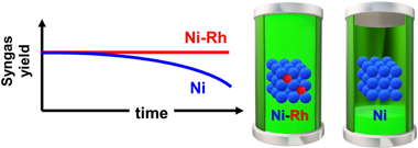 Dry reforming of methane is a very appealing catalytic route biogas (mainly composed by greenhouse gases: carbon dioxide and methane) conversion into added value syngas, which could be further upgraded to produce liquid fuels and added value chemicals. However, the major culprits of this reaction are coking and active phase sintering that result in catalysts deactivation. Herein we have developed a highly stable bimetallic Ni–Rh catalyst supported on mixed CeO2–Al2O3 oxide using low-noble metal loadings. The addition of small amounts of rhodium to nickel catalysts prevents coke formation and improves sintering resistance, achieving high conversions over extended reaction times hence resulting in promising catalysts for biogas upgrading.