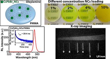 We report a facile, solvent-free surfactant-dependentmechanochemicalsynthesis of highly luminescent CsPbBr3 nanocrystals (NCs)and study their scintillation properties. A small amount of surfactantoleylamine (OAM) plays an important role in the two-step ball millingmethod to control the size and emission properties of the NCs. Thesolid-state synthesized perovskite NCs exhibit a high photoluminescencequantum yield (PLQY) of up to 88% with excellent stability. CsPbBr3 NCs capped with different amounts of surfactant were dispersedin toluene and mixed with polymethyl methacrylate (PMMA) polymer andcast into scintillator discs. With increasing concentration of OAMduring synthesis, the PL yield of CsPbBr3/PMMA nanocompositewas increased, which is attributed to reduced NC aggregation and PLquenching. We also varied the perovskite loading concentration inthe nanocomposite and studied the resulting emission properties. Themost intense PL emission was observed from the 2% perovskite-loadeddisc, while the 10% loaded disc exhibited the highest radioluminescence(RL) emission from 50 kV X-rays. The strong RL yield may be attributedto the deep penetration of X-rays into the composite, combined withthe large interaction cross-section of the X-rays with the high-Zatoms within the NCs. The nanocomposite disc shows an intense RL emissionpeak centered at 536 nm and a fast RL decay time of 29.4 ns. Further,we have demonstrated the X-ray imaging performance of a 10% CsPbBr3 NC-loaded nanocomposite disc.