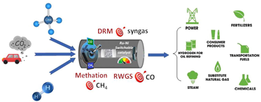 The feasibility of a Dual Function Material (DFM) with a versatile catalyst offering switchable chemical synthesis from carbon dioxide (CO2) was demonstrated for the first time, showing evidence of the ability of these DFMs to passively capture CO2 directly from the air as well. These DFMs open up possibilities in flexible chemical production from dilute sources of CO2, through a combination of CO2 adsorption and subsequent chemical transformation (methanation, reverse water gas shift or dry reforming of methane). Combinations of Ni Ru bimetallic catalyst with Na2O, K2O or CaO adsorbent were supported on CeO2-Al2O3 to develop flexible DFMs. The designed multicomponent materials were shown to reversibly adsorb CO2 between the 350 and 650 degrees C temperature range and were easily regenerated by an inert gas purge stream. The components of the flexible DFMs showed a high degree of interaction with each other, which evidently enhanced their CO2 capture performance ranging from 0.14 to 0.49 mol kg(-1). It was shown that captured CO2 could be converted into useful products through either CO2 methanation, reverse water-gas shift (RWGS) or dry reforming of methane (DRM), which provides flexibility in terms of co-reactant (hydrogen vs. methane) and end product (synthetic natural gas, syngas or CO) by adjusting reaction conditions. The best DFM was the one containing CaO, producing 104 mu mol of CH4 per kg(DFM) in CO2 methanation, 58 mu mol of CO per kg(DFM) in RWGS and 338 mu mol of CO per kg(DFM) in DRM.