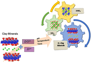 The use of zirconium in chemical industries generates a potential risk of Zr contamination in the environment, with particular concern for the decommissioning of uranium-graphite reactors. Among the natural adsorbents employed for the treatment of nuclear waste, clay minerals showed a very high affinity adsorption for radionuclides, but the influence of the chemical composition, pressure, temperature and time reaction have not yet been analysed on deep. Thus, the objective of this research is to explore several experimental conditions for an actual prediction of the behaviour of zirconium immobilization by clay minerals. The results have shown that factors such as zirconium cation nature (Zr4+ or ZrO2+), temperature, time and pH influence the extent of zirconium immobilization by clay minerals and the zirconium phases generated. At moderate conditions, zirconium tectosilicates are formed and evolve to zircon at high temperature and a longer time reaction.