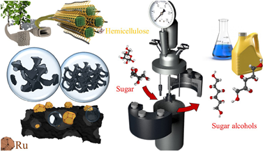 This study deals with the production and activation of biochars and their use as supports for a series of ruthenium catalysts for hydrogenation of L-arabinose/D-galactose sugar mixture. The synthesized biochars differ in physicochemical properties and surface chemistry influencing ruthenium metal uptake and dispersion and as a consequence its catalytic behaviour. Selectivity exceeding 95% was observed for both hexitols. The catalytic performance of the prepared Ru supported catalysts is also compared to the already known Ru/activated carbon commercial catalyst.