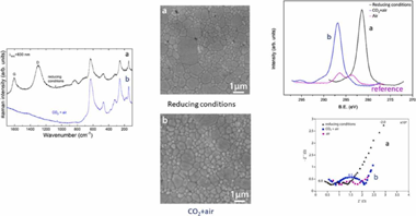 Given the need to process anodes and composites based on nano-YSZ in reducing or in air containing additional CO2 atmospheres for the fabrication of solid oxide fuel cells (SOFCs), and solid oxide electrolysis cells (SOECs), we have studied the effect of the exposure to CO+N2/H2 or CO2+air mixtures during sintering of YSZ green pellets, prepared from commercial nanopowders, on their structure, microstructure, chemical composition and their electrical properties. The reduced sample shows Raman bands at 1298 and 1605 cm−1 that are assigned to the D and G bands of carbon, respectively. The bands intensity ratio ID/IG indicates a larger content of disordered carbon. X-ray photoelectron spectroscopy (XPS) shows that C is present in the reduced samples as reduced carbon. However, the samples sintered in CO2+air present C as carbonate-type. Impedance spectroscopy reveals that the highest total conductivity is for the reduced samples in the whole range of studied temperatures. In addition, sintering in CO2+air causes a detrimental effect on the grain boundary conductivity and therefore, on the total electrical conductivity of YSZ. It can be due to the presence of impurities such as carbonates and oxidised or even, polymerised carbonaceous species located at those areas.