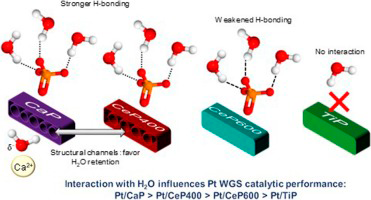 For Pt catalysts which have demonstrated great activity for the WGS reaction, the activation of water is described as the rate-limiting step. Such limitation could be overcome through the design of supports able to supply water. In this study, the hexagonal and monoclinic phases of CePO4 have been evaluated as supports for Pt WGS catalysts. The hexagonal structure presents channels containing water, absent in the monoclinic structure. The presence of these channels in the hexagonal phase increases the interaction with the water molecules, leading to an enhancement of the WGS catalytic performance. DRIFTS results showed that dissociation of water does not occur on these supports, while calculated apparent activation energies present values similar to those reported in the literature for the dissociation of water in Pt (111). These results suggest that cerium phosphates act as water suppliers, increasing the number of available species to be dissociated on the Pt surface.