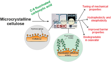 Tridecafluorononanoic acid (TFNA), a C6-fluorinated carboxylic acid, was esterified with cellulose at different molar ratios (0:1, 1:1, 2:1, and 3:1) in a trifluoroacetic acid (TFA):trifluoroacetic anhydride (TFAA):CHCl3 (2:1:1, v:v:v) solvent mixture. Free-standing films were obtained for all formulations and are presented as alternatives to composites and blends of paper with fluorinated molecules. Mechanical properties were investigated by tensile tests, and a plasticizer effect of fluorinated chains was observed. Interestingly, the wettability of these new cellulose derivatives was similar or even better than other common cellulose derivatives and fluorinated poly-mers employed in food packaging. Hydrodynamic properties were also improved by addition of TFNA, resulting in materials with water vapor permeability values comparable to other cellulose-based food packaging materials. In addition, films with the higher amounts of TFNA showed the required oil resistance for papers used in food packaging applications, as determined by the Kit Test. Finally, the biodegradation of these C6-fluorinated cel-lulose esters, assessed by biological oxygen demand (BOD) in seawater, was higher than typical bio-based polymers used in food packaging. The bioplastic synthesized at a molar ratio 1:1 (TFNA:cellulose) showed excellent performances in terms of greaseproof, hydrophobicity, ductility, and biodegradability, representing a sustainable alternative to typical plastics used in food packaging.