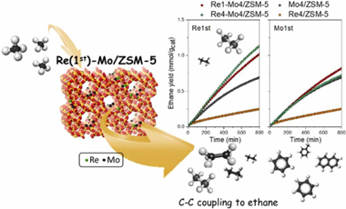 In this study, the promoting effect of rhenium addition as a co-dopant on Mo/ZSM-5 catalysts system has been analysed. Hence, bimetallic (Re-Mo/ZSM-5) catalysts have been synthesized using a sequential impregnation methodology. The catalytic performance for direct aromatization of methane reaction has been determined and correlated with their physical and chemical state combining multiple characterization techniques. An important synergy between Mo and Re, affected by the sequential impregnation, has been observed. Thus, Re1-Mo4/ZSM-5 in which Re has been incorporated first shows notably higher aromatic yields and stability against deactivation. Characterization results suggest that catalytic enhancement is due to the important effect of Re presence in close interaction with Mo. Improved evolution of ethane through C-C coupling would be correlated to this catalytic performance. As we discuss, Mo nature and location in the bimetallic systems are strongly conditioned by Re and the impregnation sequence and favours such intermediate step.