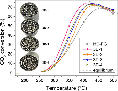 This work investigates the CO2 methanation rate of structured catalysts by tuning the geometr y of 3D-printed metal Fluid Guiding Elements (FGEs) structures based on periodically variable pseudo-gyroid geometries. The enhanced performance showed by the structured catalytic systems is mostly associated with the capability of the FGEs substrate geometries for efficient heat usages. Thus, variations on the channels diameter resulted in ca. 25% greater CO2 conversions values at intermediate temperature ranges. The highest void fraction evidenced in the best performing catalyst (3D-1) favored the radial heat transfer and resulted in significantly enhanced catalytic activity, achieving close to equilibrium (75%) conversions at 400 ? and 120 mL/min. For the 3D-1 catalyst, a mathematical model based on an experimental design was developed thus enabling the estimation of its behavior as a function of temperature, spatial velocity, hydrogen to carbon dioxide (H-2/CO2) ratio, and inlet CO2 concentration. Its optimal operating conditions were established under 3 different scenarios: 1) no restrictions, 2) minimum H-2:CO2 ratios, and 3) minimum temperatures and H-2/CO2 ratio. For instance, for the lattest scenario, the best CO2 methanation conditions require operating at 431 ?, 200 mL/min, H-2/CO2 = 3 M ratio, and inlet CO2 concentration = 10 %.