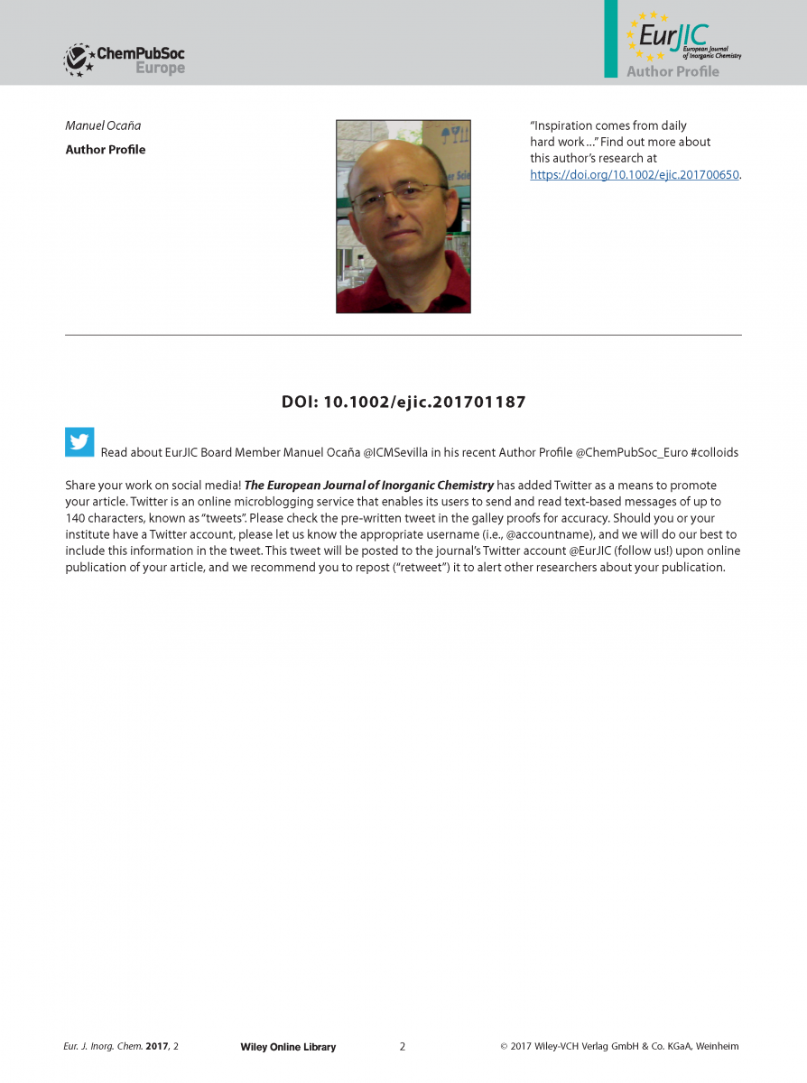 Junto a este primer premio el cicCartuja ha concedido dos accésits, otorgados a Alejandro Díaz-Moscoso –investigador  del Instituto de Investigaciones Químicas (IIQ), quien publicó su artículo en Chemistry. A European Journal– y Olalla Sánchez-Sobrado, del Instituto de Ciencia de Materiales de Sevilla (ICMS), cuyo trabajo apareció en Journals Materials of Chemistry. La dotación de estos galardones asciende a 2.000 euros para el primer premio y de 500 euros para el segundo y tercer clasificados. Estas cantidades han sido donadas por Antonio Hernández Callejas, Presidente de Ebro Foods y ganador del I Premio de la Confederación de Empresarios de Sevilla.
