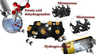 Biomass waste product was used to generate biochars as catalytic supports for selective hydrogen production from formic acid. The supports were obtained after pyrolysis in CO2 atmosphere of non-pretreated and che-mically ZnCl2 activated raw materials (vine shoot and crystalline cellulose). The support series includes materials with different textural properties and surface chemistry. The support nature and especially textural properties firstly affects significantly Pd size and dispersion and its interaction with the support and secondly influence in a great extent the catalytic behavior of the final material. The presence of prevailing mesoporous character appeared to be the most important parameter influencing formic acid dehydrogenation and overall hydrogen production.