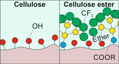 Cellulose ester films were prepared by esterification of cellulose with a multibranched fluorinated carboxylic acid, "BRFA" (BRanched Fluorinated Acid), at different anhydroglucose unit:BRFA molar ratios (i.e., 1:0, 10:1, 5:1, and 1:1). Morphological and optical analyses showed that cellulose-BRFA materials at molar ratios 10:1 and 5:1 formed flat and transparent films, while the one at 1:1 M ratio formed rough and translucent films. Degrees of substitution (DS) of 0.06, 0.09, and 0.23 were calculated by NMR for the samples at molar ratios 10:1, 5:1, and 1:1, respectively. ATR-FTIR spectroscopy confirmed the esterification. DSC thermograms showed a single glass transition, typical of amorphous polymers, at -11 degrees C. The presence of BRFA groups shifted the mechanical behavior from rigid to ductile and soft with increasing DS. Wettability was similar to standard fluoropolymers such as PTFE and PVDF. Finally, breathability and water uptake were characterized and found comparable to materials typically used in textiles.