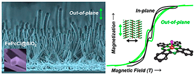 In this article we show for the first time the formation of magnetic supported organic nanowires (ONWs) driven by self-assembly of a nonplanar Fe(III) phthalocyanine chloride (FePcCl) molecule. The ONWs grow by a crystallization mechanism on roughness-tailored substrates. The growth methodology consists of a vapor deposition under low vacuum and mild temperature conditions. The structure, microstructure, and chemical composition of the FePcCl NWs are thoroughly elucidated and compared with those of Fe(II) phthalocyanine NWs by a consistent and complementary combination of advanced electron microscopies and X-ray spectroscopies. In a further step, we vertically align the NWs by conformal deposition of a SiO2 shell. Such orientation is critical to analyze the magnetic properties of the FePcCl and FePc supported NWs. A ferromagnetic behavior below 30 K with an easy axis perpendicular to the phthalocyanine plane was observed in the two cases with the FePcCl nanowires presenting a wider hysteresis. These results open the path to the fabrication of nanostructured one-dimensional small-molecule spintronic devices.