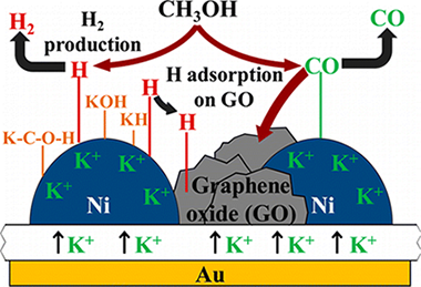This paper reports a groundbreaking approach for simultaneous hydrogen production and storage that entails catalysis, electrochemistry, surface science, and materials synthesis. A novel electrocatalytic system is developed based on nickel nanocolumnar films of controlled microstructure prepared on K-βAl2O3 solid electrolyte supports by oblique angle physical vapor deposition. The outstanding characteristics of this system are a hydrogen storage capacity of up to 19 g of H2 (100 g of Ni)−1, which is unparalleled in the literature and the possibility of controlling its release electrochemically, under fixed mild conditions (280 °C and normal pressure). H2 is produced in situ by methanol steam re-forming on the Ni catalyst, and it spills over onto graphene oxide aggregates formed during the catalytic process, as confirmed by SEM, FTIR, and Raman spectroscopy. The proposed storage mechanism considers a synergetic contribution of both Ni and graphene oxide, promoted by K+ ions, in enhancing the hydrogen storage capacity of the system.