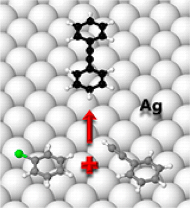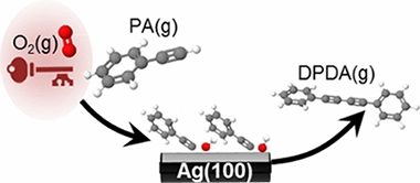 The essential role of oxygen in enabling heterogeneously catalyzed Glaser–Hay coupling of phenylacetylene on Ag(100) was elucidated by STM, laboratory and synchrotron photoemission, and DFT calculations. In the absence of coadsorbed oxygen, phenylacetylene formed well-ordered dense overlayers which, with increasing temperature, desorbed without reaction. In striking contrast, even at 120 K, the presence of oxygen led to immediate and complete disruption of the organic layer due to abstraction of acetylenic hydrogen with formation of a disordered mixed layer containing immobile adsorbed phenylacetylide. At higher temperatures phenylacetylide underwent Glaser–Hay coupling to form highly ordered domains of diphenyldiacetylene that eventually desorbed without decomposition, leaving the bare metal surface. DFT calculations showed that, while acetylenic H abstraction was otherwise an endothermic process, oxygen adatoms triggered a reaction-initiating exothermic pathway leading to OH(a) + phenylacetylide, consistent with the experimental observations. Moreover, it was found that, with a solution of phenylacetylene in nonane and in the presence of O2, Ag particles catalyzed Glaser–Hay coupling with high selectivity. Rigorous exclusion of oxygen from the reactor strongly suppressed the catalytic reaction. Interestingly, too much oxygen lowers the selectivity toward diphenyldiacetylene. Thus, vacuum studies and theoretical calculations revealed the key role of oxygen in the reaction mechanism, subsequently borne out by catalytic studies with Ag particles that confirmed the presence of oxygen as a necessary and sufficient condition for the coupling reaction to occur. The direct relevance of model studies to a mechanistic understanding of coupling reactions under conditions of practical catalysis was reaffirmed.