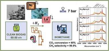 Direct upgrading of biogas by CO2 methanation aims to produce a gas to be injected into the grid. Operating at moderate pressures favors thermodynamics, but catalyst surface and reaction mechanism under realistic conditions are not well investigated. We study the role of basic and metallic sites on performance and mechanism of clean biogas methanation (CO2/CH4=1/1 v/v) at 1, 5 and 7 bar. Ni/Mg/La/Al hydrotalcite-derived catalysts, with different Ni and La contents, are investigated combining tests and physico-chemical characterization, including quasi-in situ XPS at 7 bar, with CO2-adsorption and methanation DRIFTS at 1 and 7 bar, respectively. An optimized catalyst (6.5 wt% La, 35 wt% Ni) with 3-4 nm Ni0 and balanced basicity, achieves 96 LCH4*gcat- 1* h- 1 (300 degrees C, 7 bar). DRIFTS confirm catalysts activity experimental trend. Optimizing Ni and La results in higher consumption rates of formate intermediate and sufficient Ni0 sites for CO formation. Increasing pressure to 7 bar promotes CO and m-HCOO reactivity.