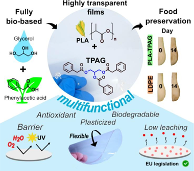 Triphenyl Acetic Glyceroate as a sustainable multifunctional additive for developing transparent, biodegradable, and flexible polylactide green alternative to polyethylene-based films for food packaging