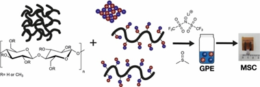 Gel polymer electrolytes (GPEs) are regarded as a promising alternative to conventional electrolytes, combining the advantages of solid and liquid electrolytes. Leveraging the abundance and eco-friendliness of cellulose-based materials, GPEs were produced using methyl cellulose and incorporating various doping agents, either an ionic liquid (1-Butyl-1-methylpyrrolidinium bis(trifluoromethylsulfonyl)imide [Pyr14][TFSI]), its polymeric ionic liquid analogue (Poly(diallyldimethylammonium bis(trifluoromethylsulfonyl)imide) [PDADMA][TFSI]), or an anionically charged backbone polymeric ionic liquid (lithium poly[(4-styrenesulfonyl)(trifluoromethyl(S-trifluoromethylsulfonylimino) sulfonyl) imide] LiP[STFSI]). The ion dynamics and molecular interactions within the GPEs were thoroughly analyzed using Attenuated Total Reflectance Fourier-Transform Infrared Spectroscopy (ATR-FTIR), Heteronuclear Overhauser Enhancement Spectroscopy (HOESY), and Pulsed-Field Gradient Nuclear Magnetic Resonance Diffusion (PFG-NMR). Li+ transference numbers (tLi+) were successfully calculated. Our study found that by combining slow-diffusing polymeric ionic liquids (PILs) with fast-diffusing lithium salt, we were able to achieve transference numbers comparable to those of liquid electrolytes, especially with the anionic PIL, LiP[STFSI]. This research highlights the influence of the polymer ' s nature on lithium-ion transport within GPEs. Additionally, micro supercapacitor (MSC) devices assembled with these GPEs exhibited capacitive behavior. These findings suggest that further optimization of GPE composition could significantly improve their performance, thereby positioning them for application in sustainable and efficient energy storage systems.