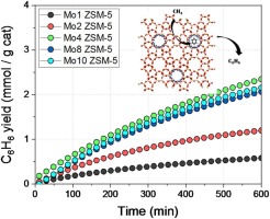 We have prepared a series of Mo/ZSM-5 systems by impregnation method with different metal loading. The optimum performance has been attained for 4% metal loading, yielding to ca. 2 mmol(benzene)/g(ca)(t) at the end of the reaction. The obtained catalysts were widely structural and surface characterized. As Mo content increases, the surface feature of the support is affected specially its mesoporosity. It has been stated the enormous complexity of Mo species present in the studied system. In situ characterization by XPS reveals different reduction and carburization behaviour depending on the Mo content.
